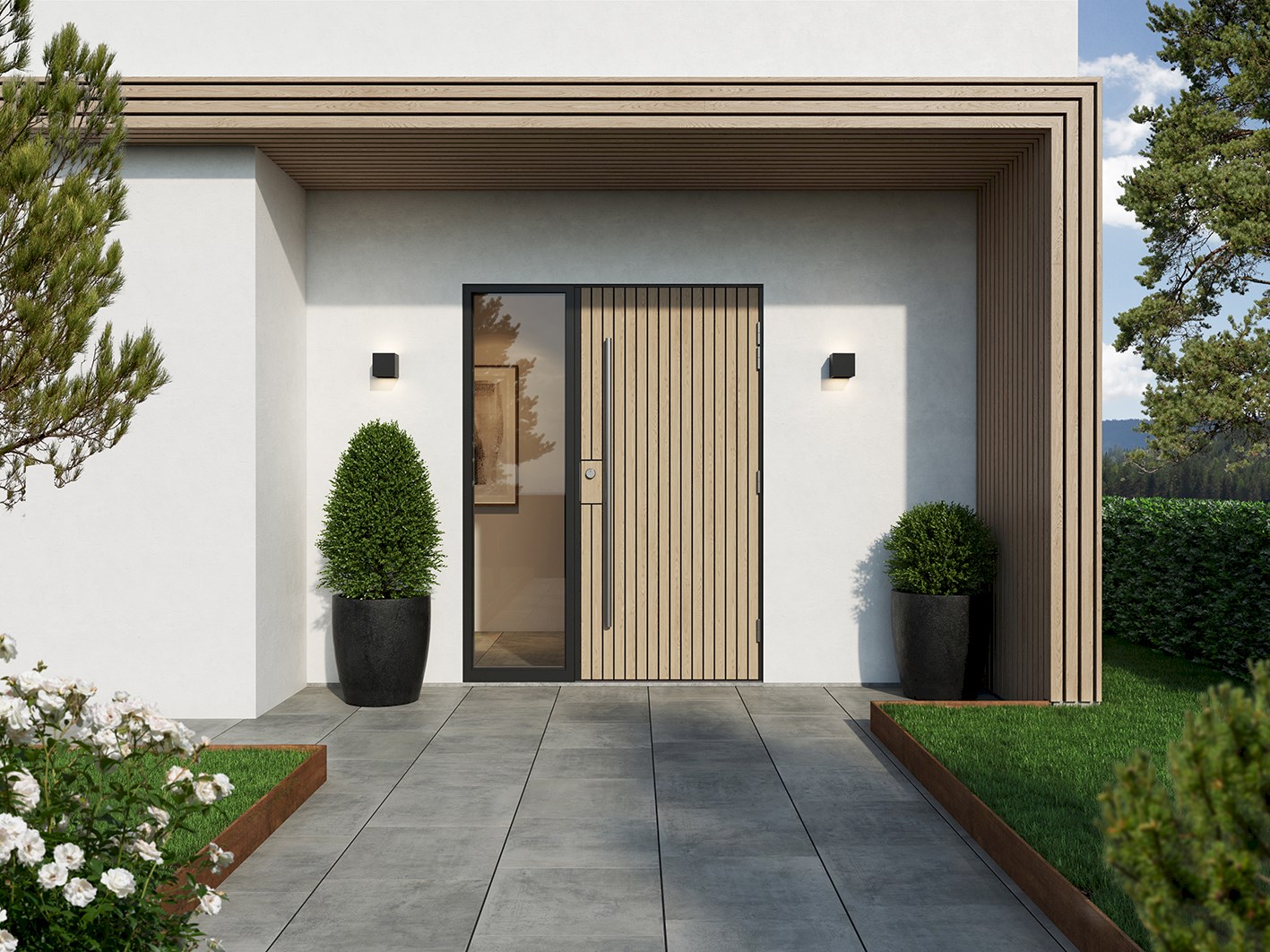 - Komplette løsninger: Du kan velge en enkelt dør eller et helt inngangsparti med sidefelt og overlys. Hele konstruksjonen leveres ferdig sammensatt for et helhetlig og vakkert utseende.